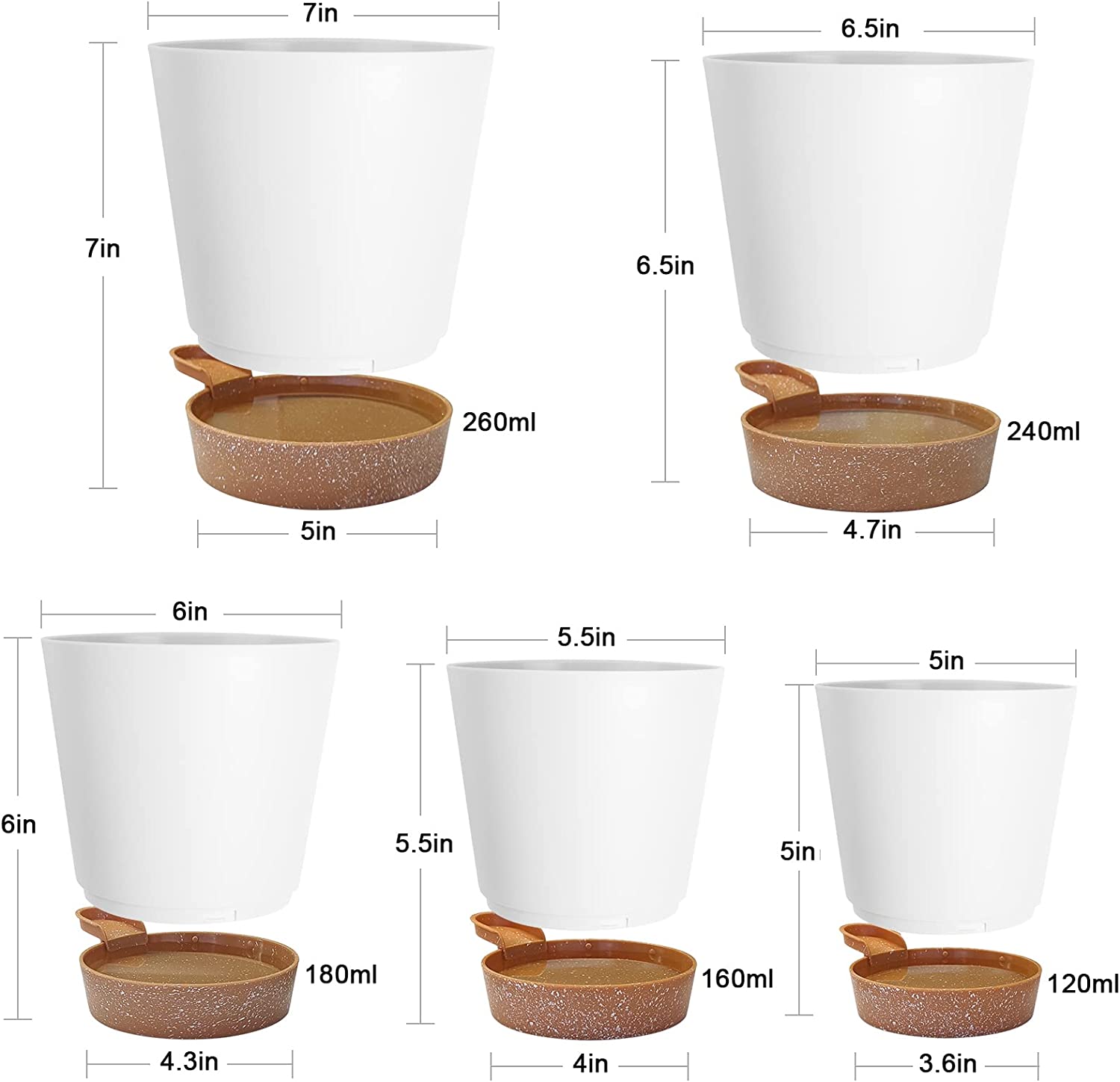 • 🍀Self Watering Planters Meet the Demand for Water –Designed the base as a reservoir, pots for indoor plants can store up 120ml/160ml/180ml/240ml/260ml of water at one time to meet the required water by plants for a week or even longer without frequent watering