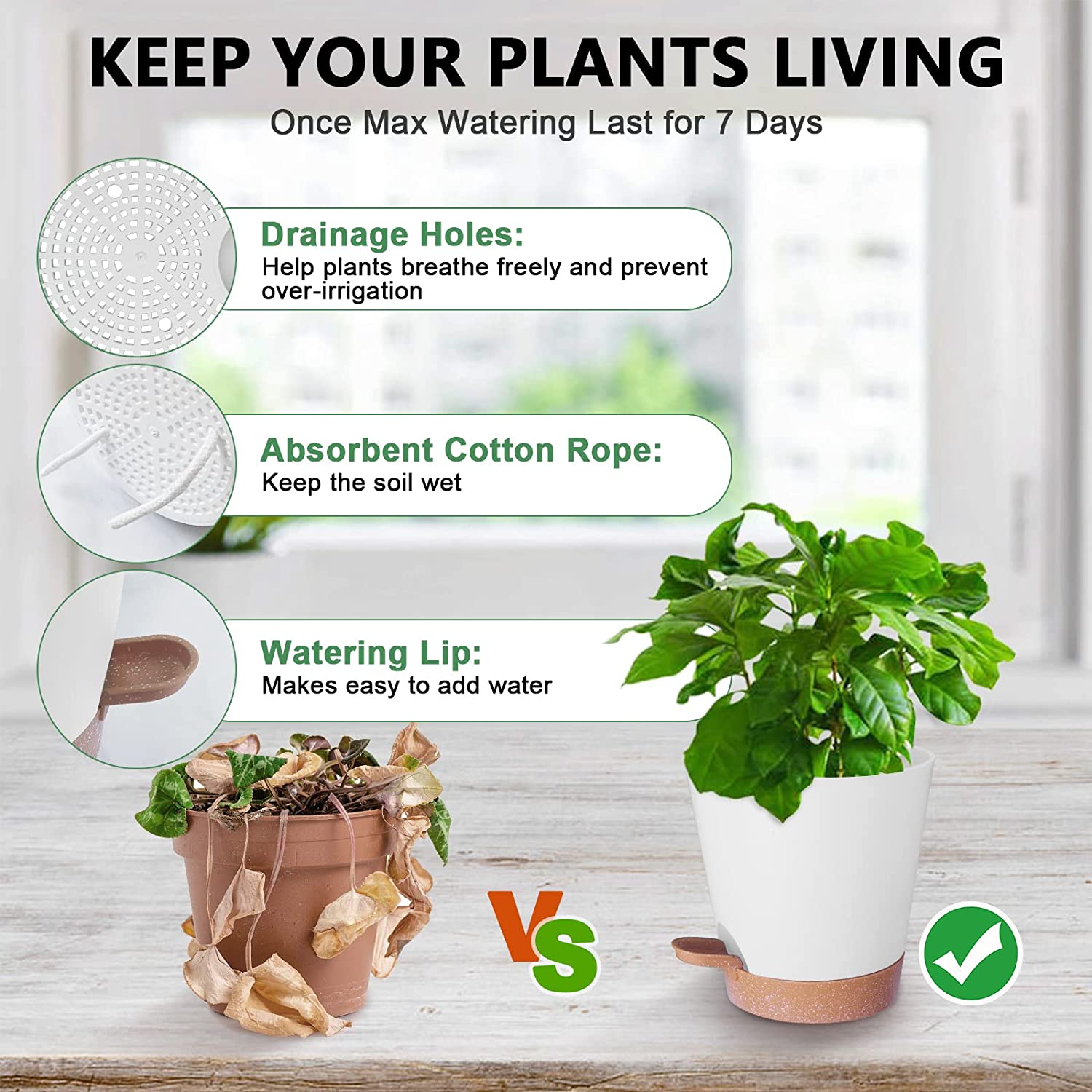 • 🍀The Best Drainage Design –Self watering pots for indoor plants is designed with 178 drainage holes, absorbent cotton rope and bottom reservoir at the bottom of the upper pot. The design of 178 drainage holes ensures that the plant roots can breathe, filter out excess water, and prevent plant root rot. The super breathability and drainage will be favored by your plants,which be able to accompany you for a longer time