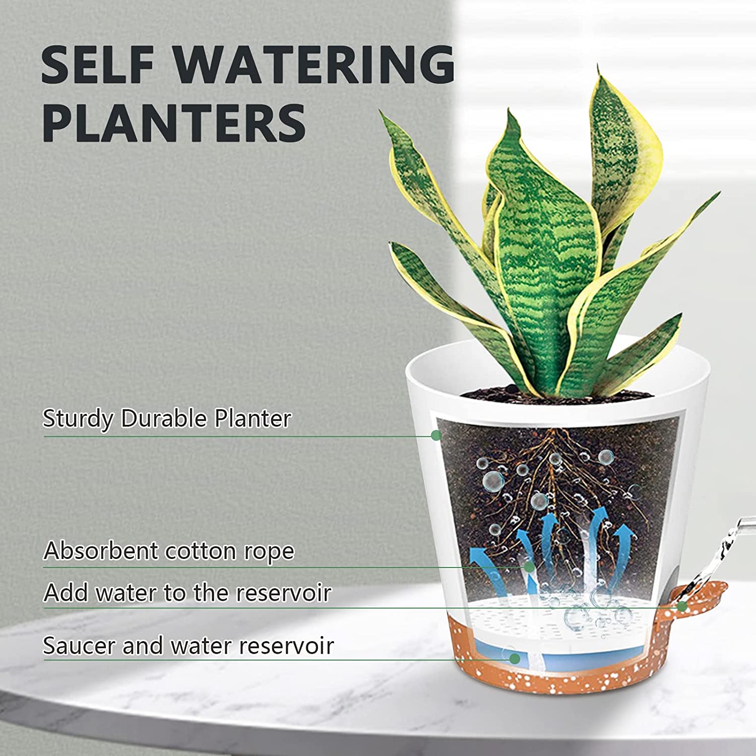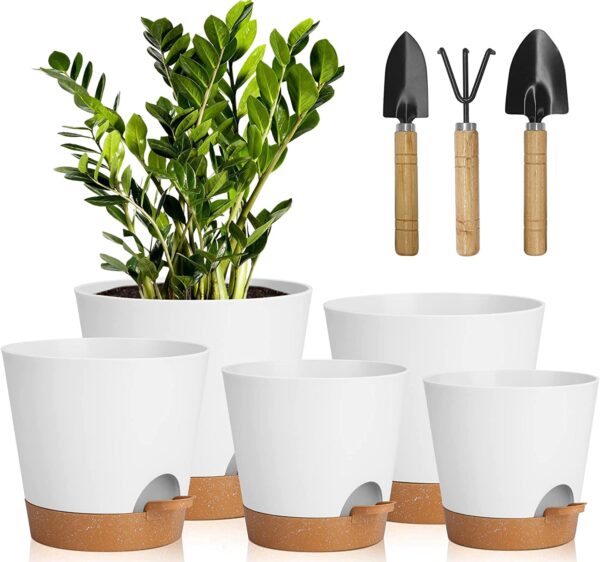 • 🍀Different Size Combo –These indoor pots for plants combines with 5 different sizes, which are suitable for planting most small and medium-sized home/office plants works well.White brown self watering pot and matte finishing exterior, bringing out a modern minimalistic styled. The round self watering plant pots are perfect for most small to medium-sized indoor house plants and herb spice. Works well with orchid, cactus, succulents, aloe vera, basil, flowers, Peace Lily,air plants, snake plant